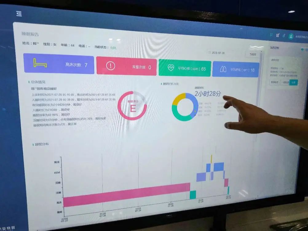 除了輸液外,患者的生命體征和運(yùn)動(dòng)軌跡也是醫(yī)護(hù)人員需要時(shí)刻操心的問題。智慧病房搭建智能在床實(shí)時(shí)監(jiān)測(cè)系統(tǒng),在床墊下放置了傳感器,可以精準(zhǔn)測(cè)量和傳輸患者的生命體征、睡眠、離床等數(shù)據(jù),一旦數(shù)據(jù)異常或者患者長(zhǎng)時(shí)間不在監(jiān)測(cè)范圍內(nèi),系統(tǒng)會(huì)自動(dòng)進(jìn)行異常或離床、跌落等警報(bào),可以及時(shí)避免意外事件發(fā)生。